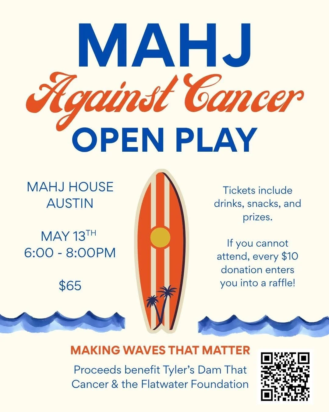 Join us at Mahj House Austin on May 13th from 6:00–8:00 PM for an evening of mahjong play benefiting Dam That Cancer and the Flatwater Foundation. Tickets are $65 and include drinks, snacks, and prizes. Can’t attend? Every $10 donation enters you into a raffle. Come play and give back!