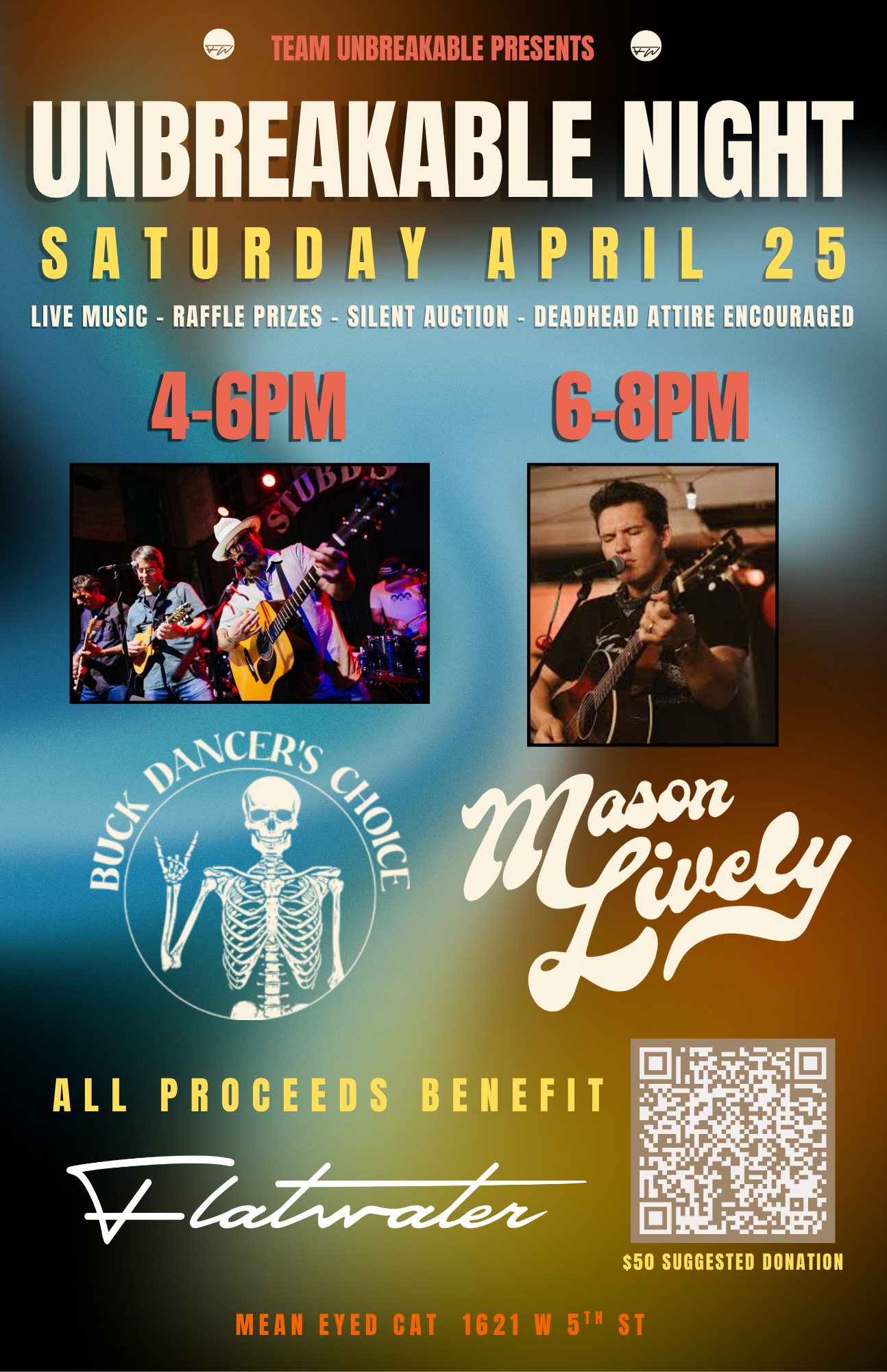 Unbreakable Night Saturday, April 25, 2026 4:00 PM 8:00 PM Mean Eyed Cat 1621 West 5th Street Austin, TX, 78703 United States (map) Google Calendar ICS
